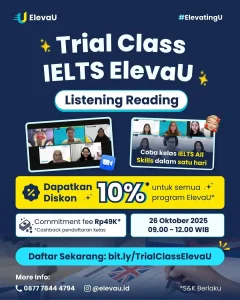 Kabar baiknya, ElevaU akan mengadakan TRIAL CLASS IELTS Reading and Listening, di Minggu, 26 Oktober 2025. Daftar di sini, ya!